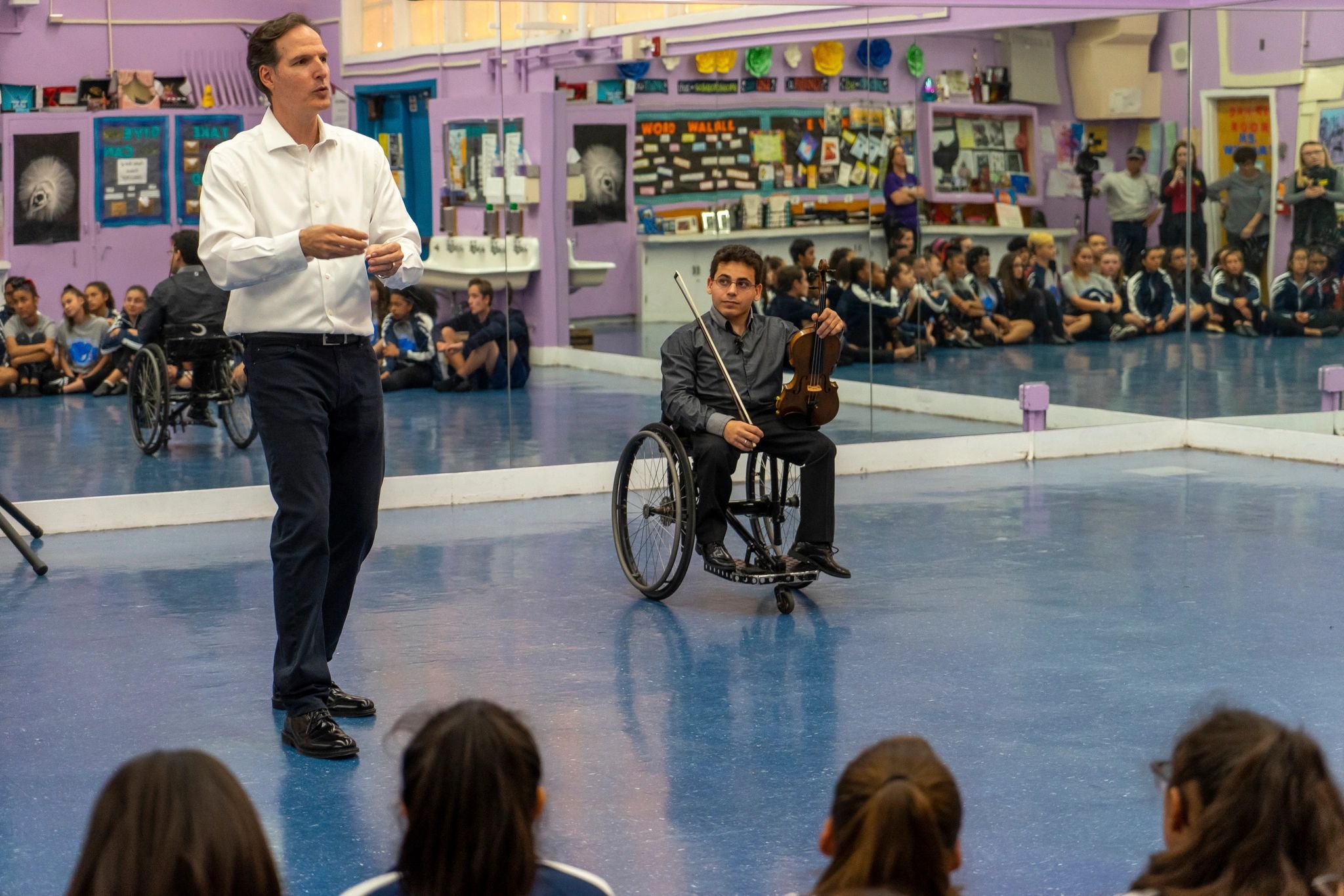 LA Musician, Niv Ashkenazi, will lead educational workshops with K-12 students in the San Fernando Valley. In the above photo Dr Anthony Cantrell, Director of Arts Education at The Soraya, explains to a class while Ashkenazi is ready to play.